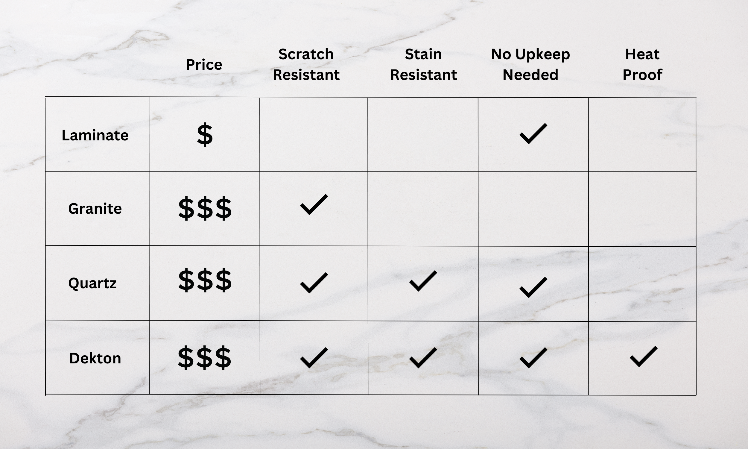 Quartz is stain resistant, scratch resistant, and an extremely durable surface to have in your kitchen. Stain resistant does not mean stain proof, so you need to wipe up spills like wine or grape juice immediately. Quartz is not heat resistant, so you cannot place a hot pan directly on the countertop with this material without the possibility of cracking.